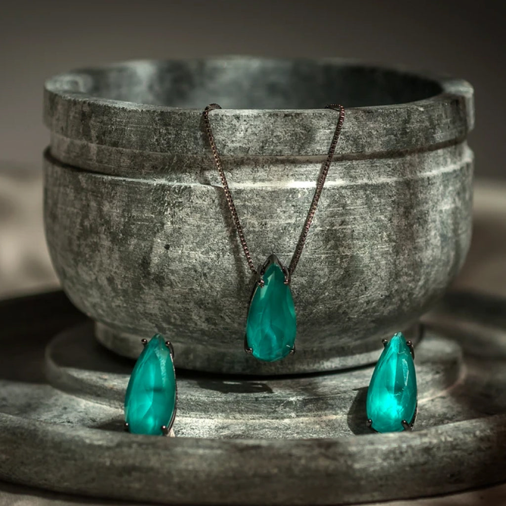 Aseta korvakorut ja kaulakoru pitkänomaiset vihreät taivaspisarat Fusion Stone Ju