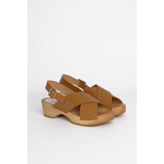 Les sabots sandales YRUN, fabriqués en cuir de vachette pleine fleur à tannage végétal, sont composés de deux larges lanières croisées enveloppant le coup de pied pour un maintien parfait.