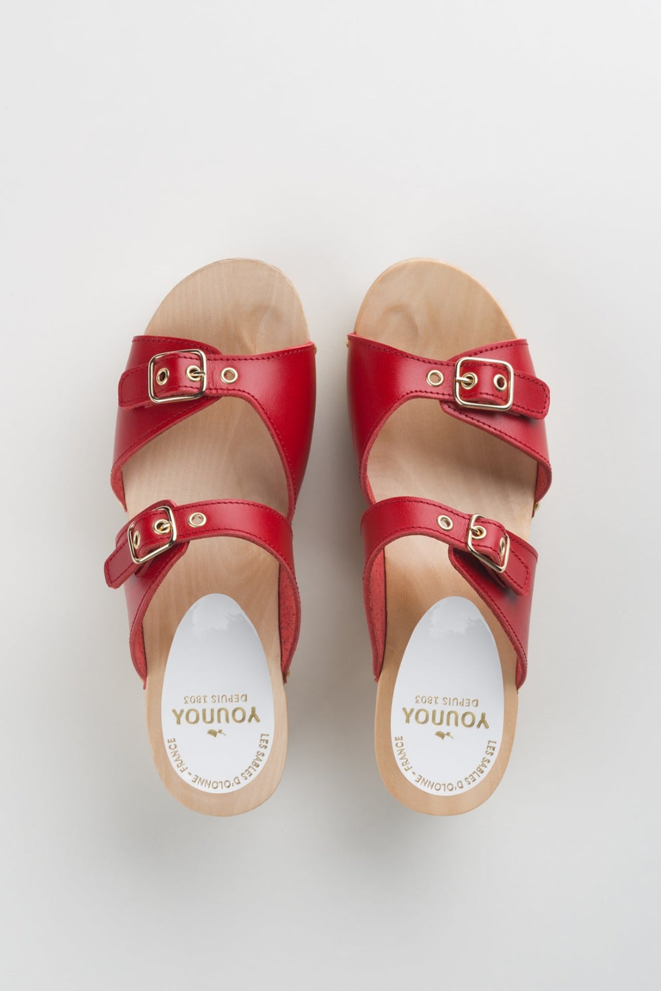 Les sabots sandales YVONNE, fabriqués en cuir de vachette pleine fleur à tannage végétal, sont relevés par un joli jeu de lanières pour un maintien parfait.