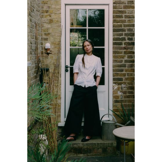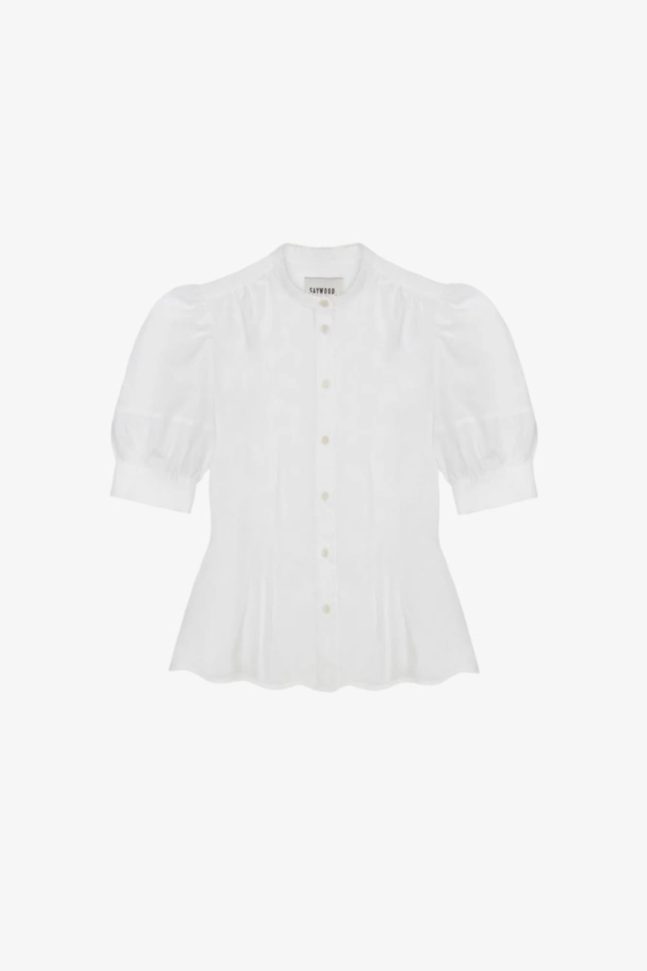 Nodding to 1940s styles, our Joni blouse is a versatile wardrobe addition. Its gentle fit-and-flare waist brings a feminine touch, and is balanced by the full puffed sleeves, which gather into an adjustable corozo button cuff at the elbow. Sitting just below the hips for a flattering look, it?s trimmed with cotton lace at the collar and finished with a pretty scalloped hem. Also available in lemon.