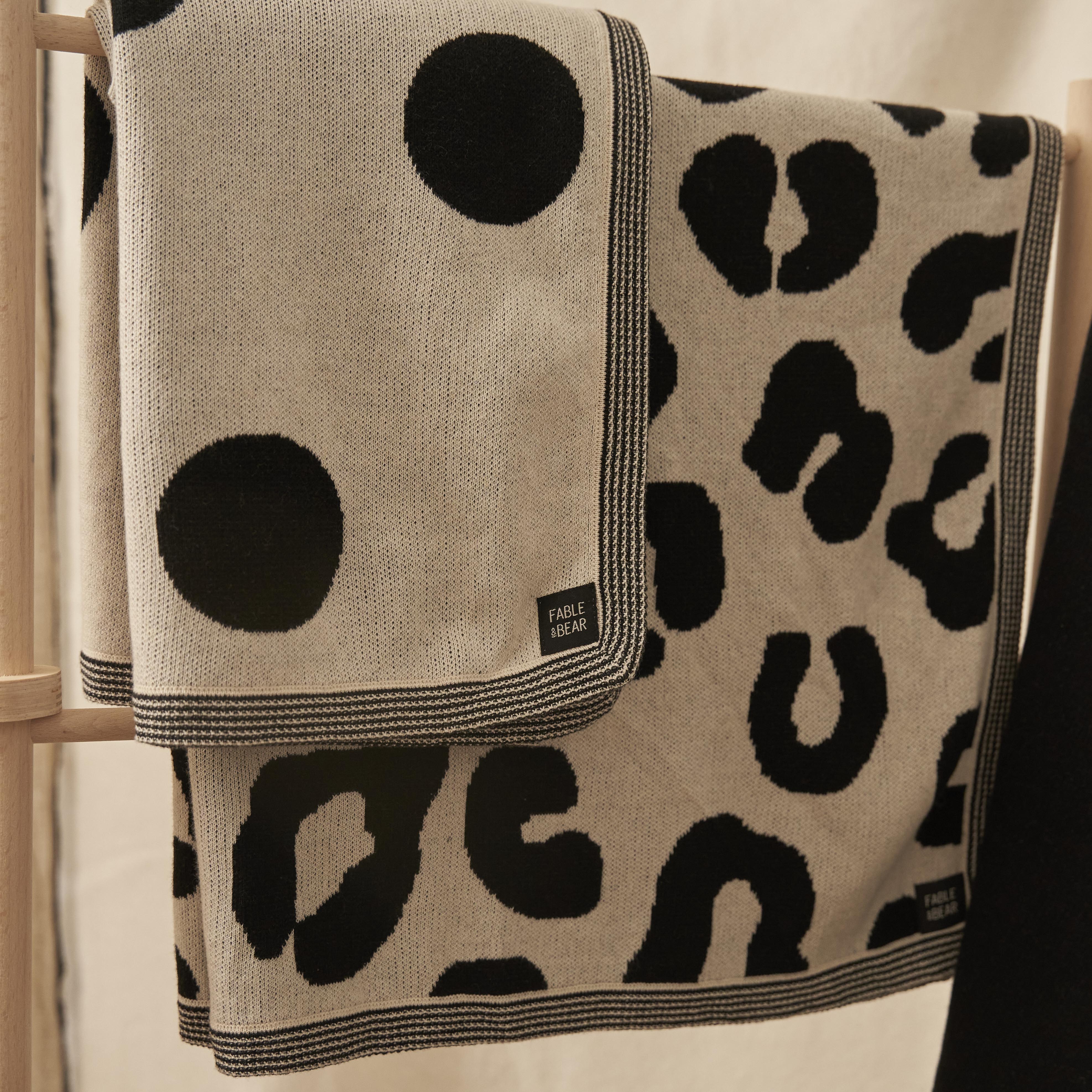 See the leopard print design on the front of the blanket with a stripy boarder all around the edge.