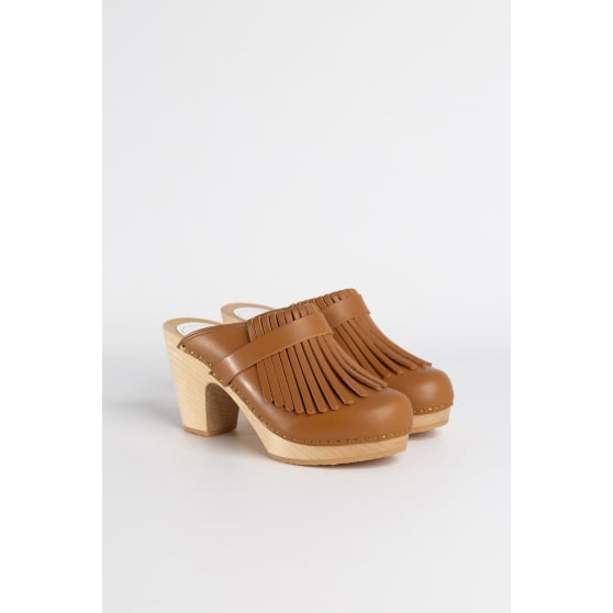 The YDEM clogs, made from vegetable-tanned full-grain cowhide leather, are enhanced with a leather fringe on the top.