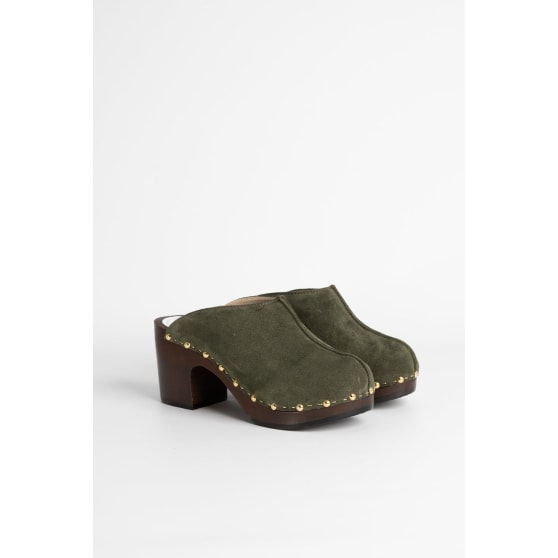 Avec sa teinte végétale et sa ligne intemporelle, le YNDIES VELVET VERT s?impose comme une pièce forte et naturelle. Confectionné en croûte de vachette velours vert, doublé en pleine fleur de veau, il offre un toucher doux et une belle profondeur de matière. Sa couture inversée sur le dessus apporte une signature artisanale discrète. Monté sur une semelle en bois de tilleul ciré, il repose sur un talon de 7,5 cm pour une silhouette élancée sans compromis sur le confort. Orné de 42 clous dorés semi-bombés posés à la main, ce sabot allie équilibre, style et savoir-faire. Un modèle à enfiler toute l?année, pour celles qui aiment conjuguer élégance durable et esprit libre.