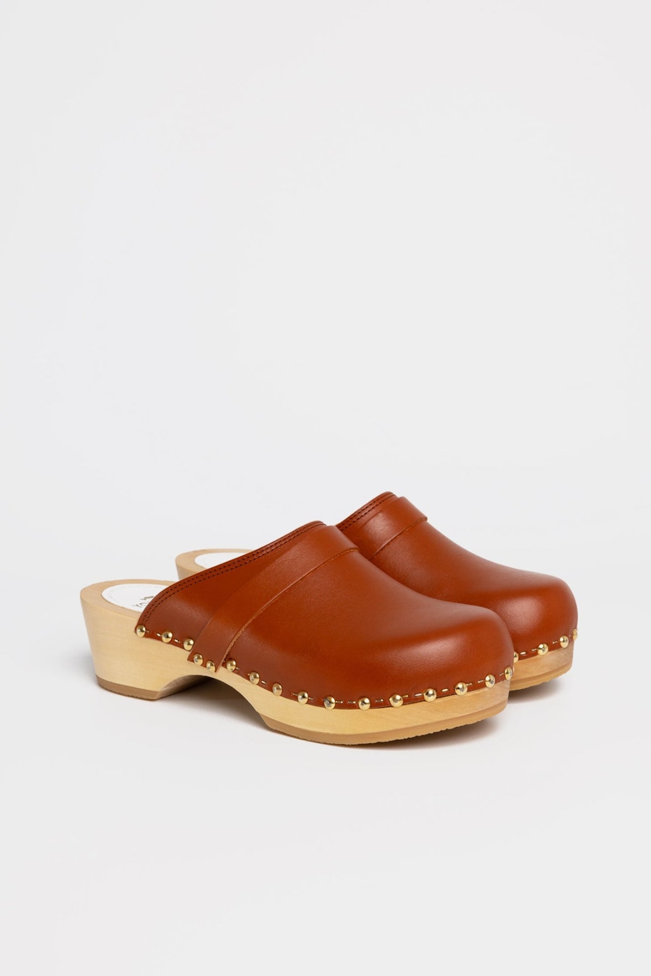 YREN ROCK clogs, made from vegetable-tanned full-grain cowhide leather, are enhanced with a leather strap on top.