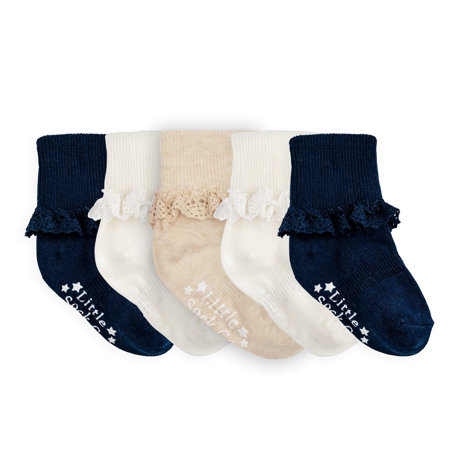 Niissä on leikkisä pitsi nilkassa ja pehmeä, liukumaton pohja, jotka varmistavat, että pienokaisesi on turvassa liikkuessaan.