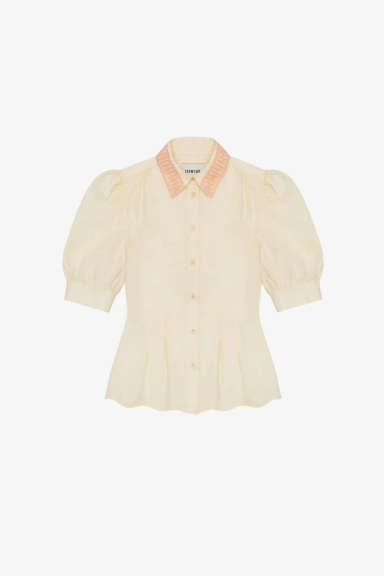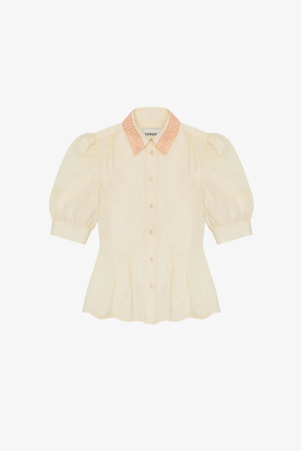 A riff on 1940s shirting, our Joni blouse pops in sunny yellow. Cut in an ultra-flattering nip-and-flare silhouette, it?s replete with feminine details: the voluminous puffed sleeves that gather into an adjustable Codelite® button cuff at the elbow; the deep collars with contrasting pastel orange cotton lace trim; the scalloped hem. Finishing just below the hips, it?s made in London from super soft cotton. Also available in white.