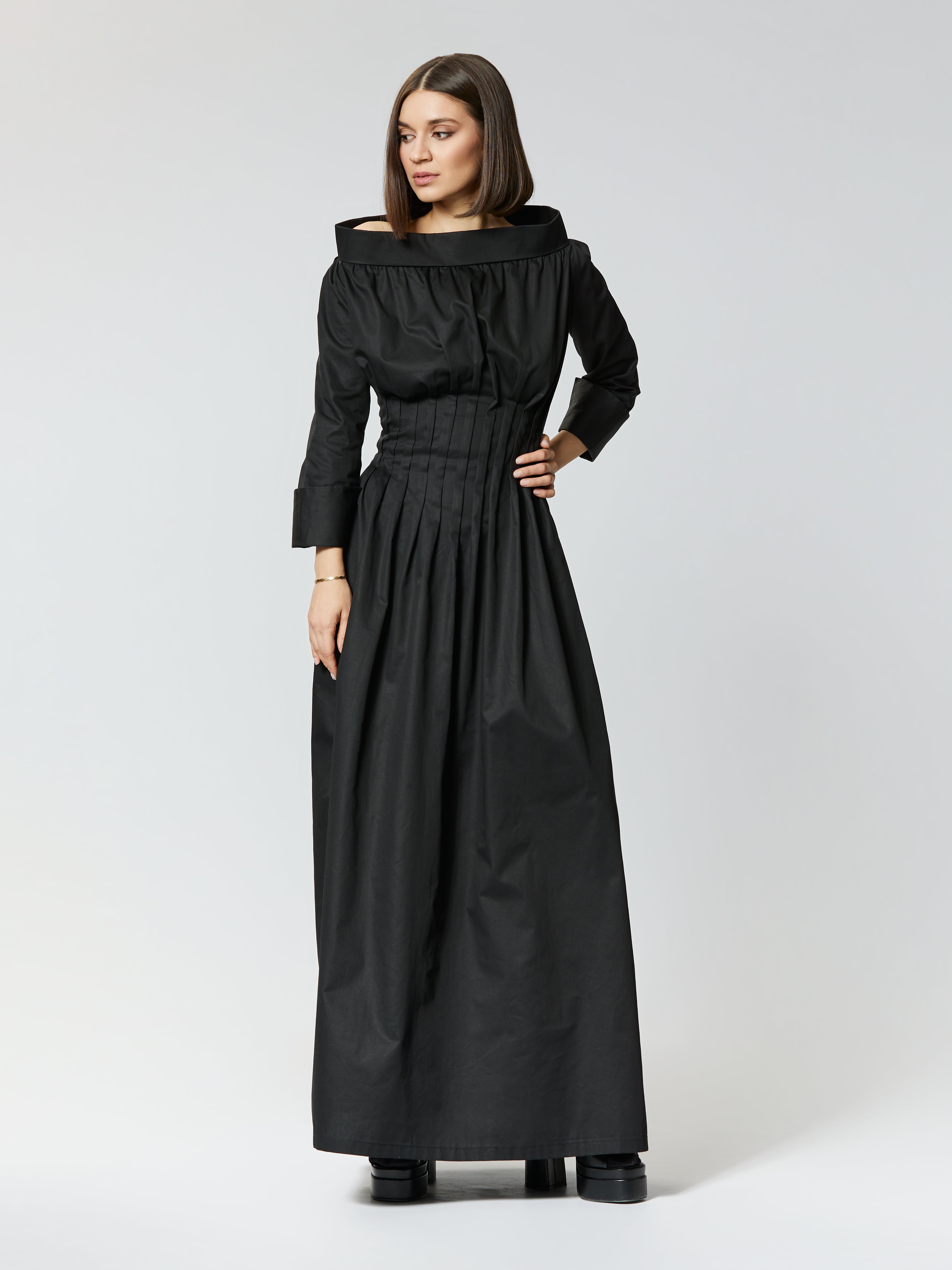 The SEYA dress offers an exclusive blend of contemporary chic and timeless elegance. Crafted from GOTS certified organic cotton, this superior quality long dress features a statement round collar, a corset illusion, and is versatile enough to pair with sneakers or stilettos.