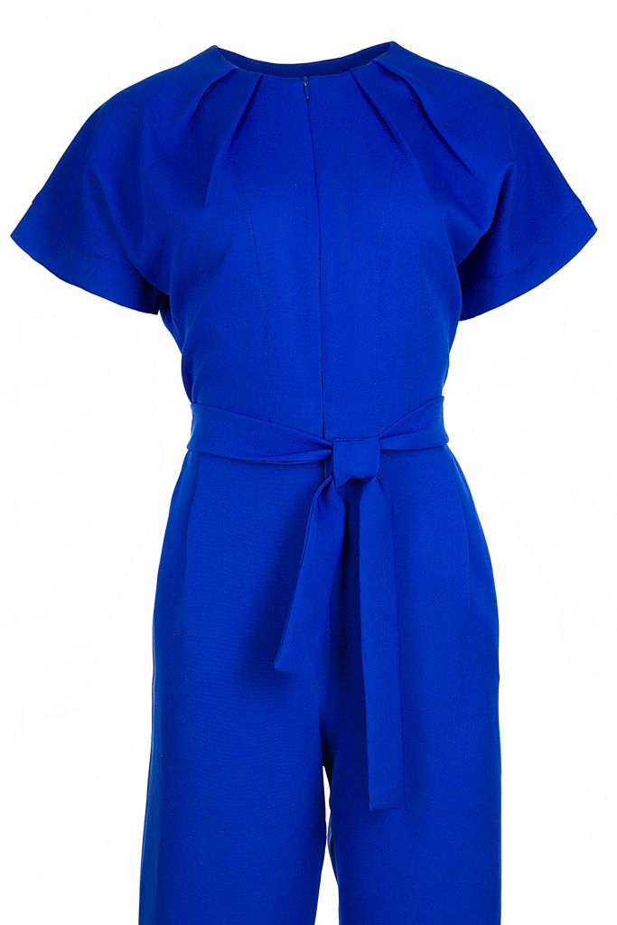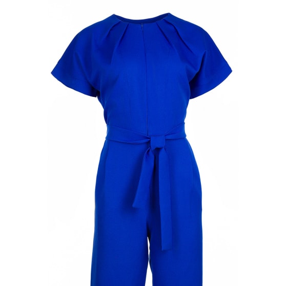 This Royal Blue Summer Jumpsuit Has A High Neckline With Pleats And Hidden Front Fastening.