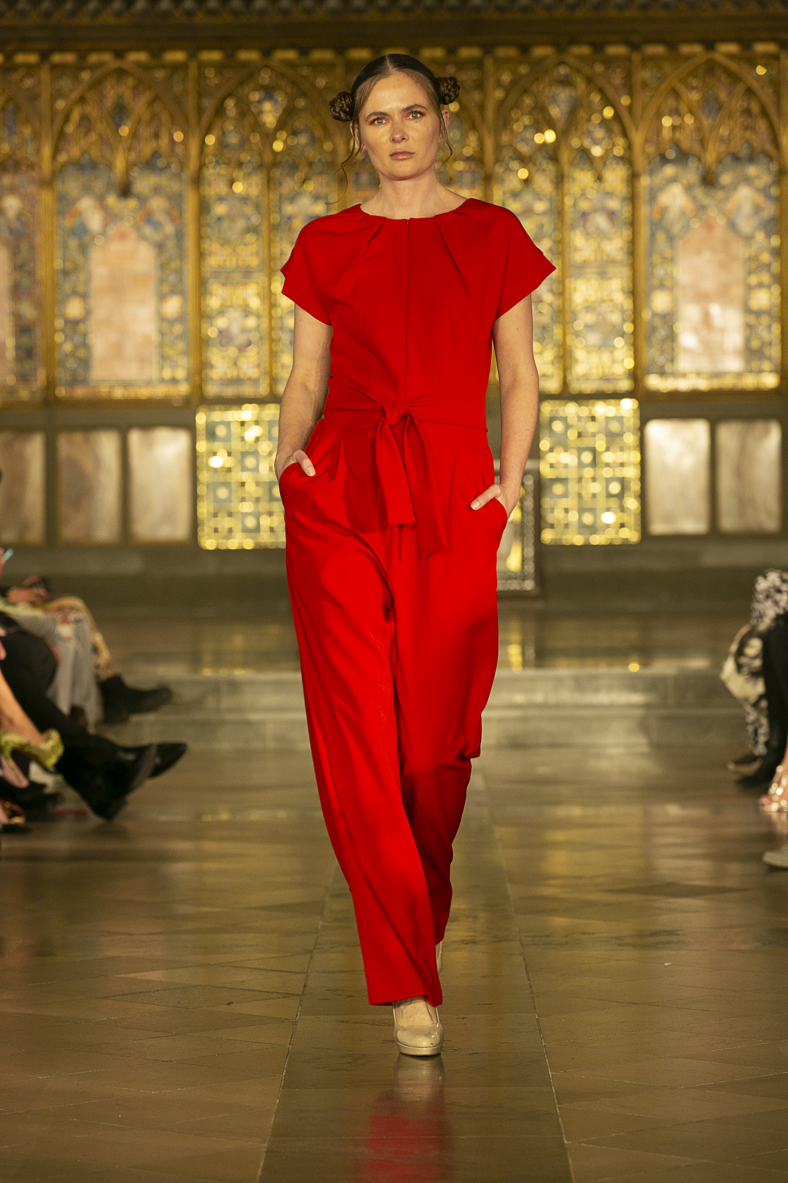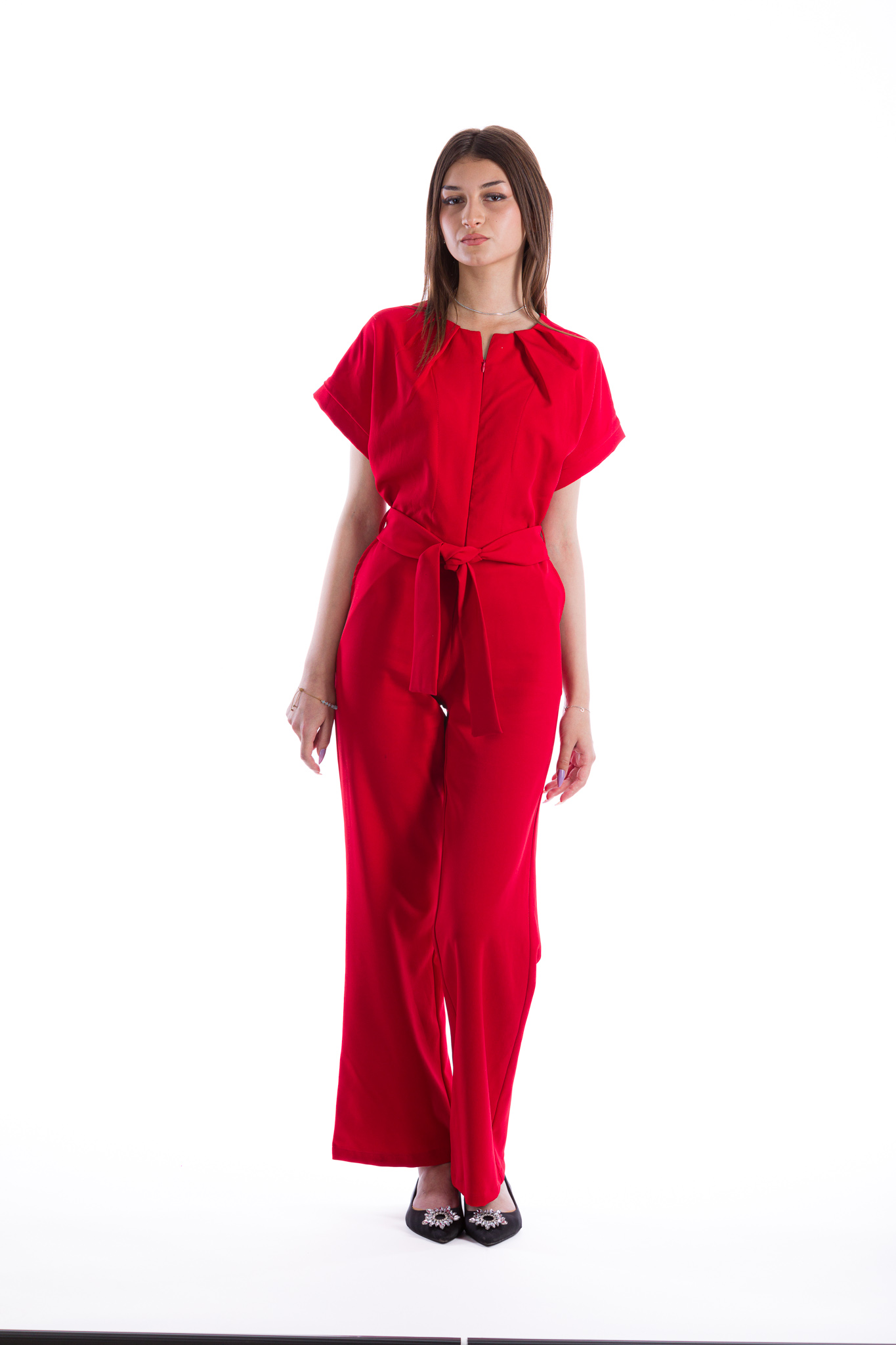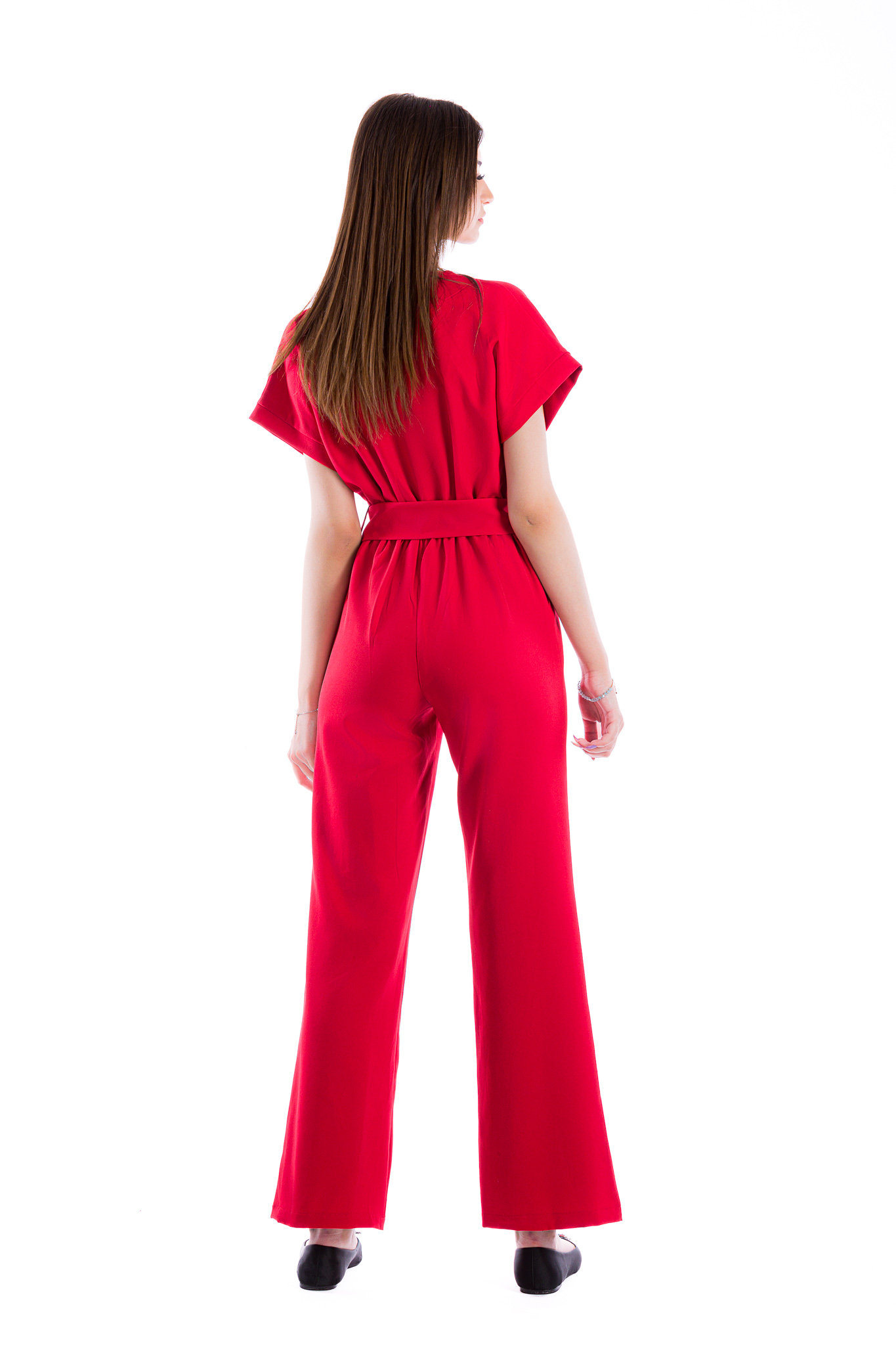 This Wide-leg Red Jumpsuit By Bibi Sakalieva's Latest Collection Has A High Neckline With Pleats And Hidden Front Fastening. Wide Straight Legs And Delicate Pockets In The Side Seam Give And Elegant And The Same Time Casual Look. Equally Well Combined With High Shoes Or Sneakers. Suitable For Any Age And Different Figure.